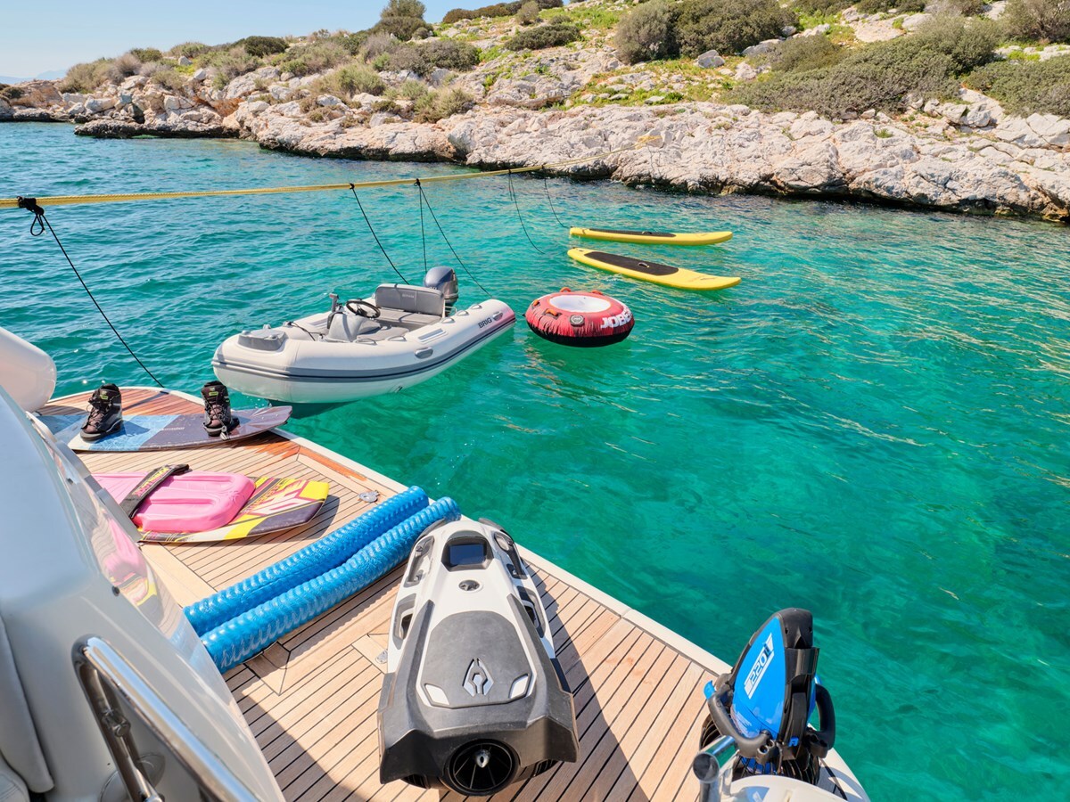 At-anchor Stabilizers, Hydraulic Gangway, Teak Cockpit, Balcony, Liferaft, Passerelle, Underwater Lights, Solar Panel, Underway Stabilizers, Swimming Ladder, Gangway